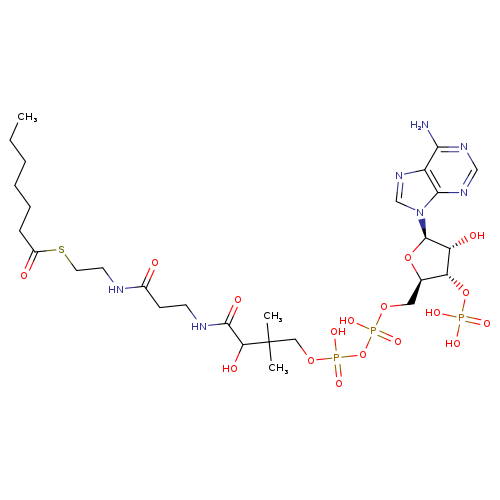 | InChI Identifier | InChI=1S/C28H48N7O17P3S/c1-4-5-6-7-8-19(37)56-12-11-30-18(36)9-10-31-26(40)23(39)28(2,3)14-49-55(46,47)52-54(44,45)48-13-17-22(51-53(41,42)43)21(38)27(50-17)35-16-34-20-24(29)32-15-33-25(20)35/h15-17,21-23,27,38-39H,4-14H2,1-3H3,(H,30,36)(H,31,40)(H,44,45)(H,46,47)(H2,29,32,33)(H2,41,42,43)/t17-,21-,22-,23?,27-/m1/s1 |