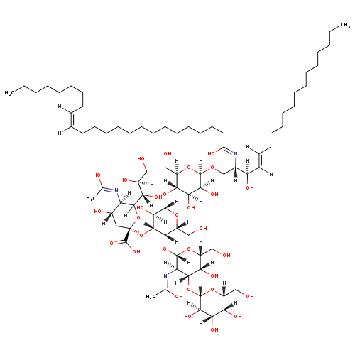 | SMILES | [H]\C(CCCCCCCC)=C(/[H])CCCCCCCCCCCCCC(O)=N[C@@]([H])(CO[C@]1([H])O[C@]([H])(CO)[C@@]([H])(O[C@]2([H])O[C@]([H])(CO)[C@]([H])(O[C@]3([H])O[C@]([H])(CO)[C@]([H])(O)[C@]([H])(O[C@]4([H])O[C@]([H])(CO)[C@]([H])(O)[C@]([H])(O)[C@@]4([H])O)[C@@]3([H])N=C(C)O)[C@]([H])(O[C@@]3(C[C@]([H])(O)[C@@]([H])(N=C(C)O)C([H])(O3)[C@@]([H])(O)[C@@]([H])(O)CO)C(O)=O)[C@@]2([H])O)[C@]([H])(O)[C@]1([H])O)[C@]([H])(O)C(\[H])=C(/[H])CCCCCCCCCCCCC |