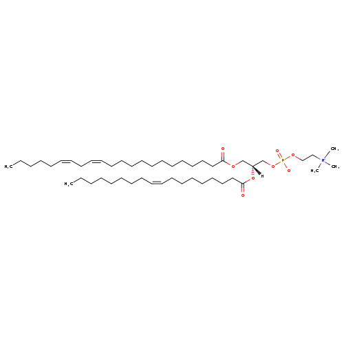 | Description | PC(22:2(13Z,16Z)/18:1(9Z)) is a phosphatidylchloline (PC). It is a glycerophospholipid in which a phosphorylcholine moiety occupies a glycerol substitution site. As is the case with diacylglycerols, phosphatidylcholines can have many different combinations of fatty acids of varying lengths and saturation attached to the C-1 and C-2 positions. PC(22:2(13Z,16Z)/18:1(9Z)), in particular, consists of one 13Z,16Z-docosadienoyl chain to the C-1 atom, and one 9Z-octadecenoyl to the C-2 atom. In E. coli, PCs can be found in the integral component of the cell outer membrane. They are hydrolyzed by Phospholipases to a 2-acylglycerophosphocholine and a carboxylate. |