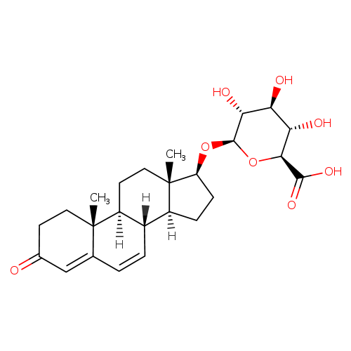 | 6,7-Didehydrotestosterone O-glucuronide | ChEBI | | 6-Dehydrotestosterone O-glucuronide | ChEBI | | 3-Oxoandrosta-4,6-dien-17beta-yl beta-D-glucopyranosiduronic acid | HMDB | | 3-Oxoandrosta-4,6-dien-17beta-yl beta-delta-glucopyranosiduronic acid | HMDB | | 6-Dehydrotestosterone 17-glucosiduronic acid | HMDB | | 6-Dehydrotestosterone 17-glucosiduronate | Generator |