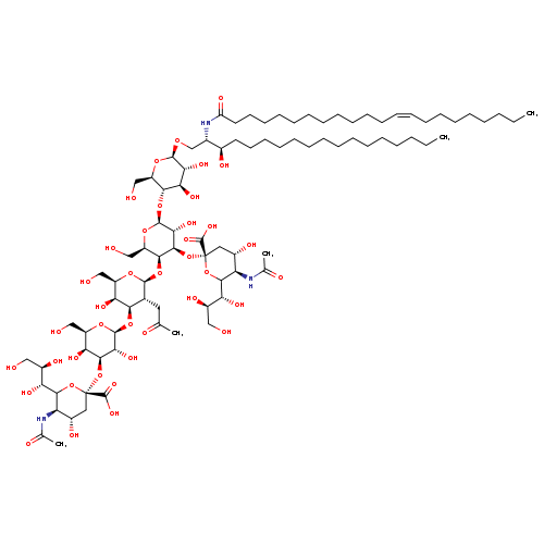 | SMILES | CCCCCCCCCCCCCCC[C@@H](O)[C@H](CO[C@@H]1O[C@H](CO)[C@@H](O[C@@H]2O[C@H](CO)[C@H](O[C@@H]3O[C@H](CO)[C@H](O)[C@H](O[C@@H]4O[C@H](CO)[C@H](O)[C@H](O[C@@]5(C[C@H](O)[C@@H](NC(C)=O)C(O5)[C@H](O)[C@H](O)CO)C(O)=O)[C@H]4O)[C@H]3CC(C)=O)[C@H](O[C@@]3(C[C@H](O)[C@@H](NC(C)=O)C(O3)[C@H](O)[C@H](O)CO)C(O)=O)[C@H]2O)[C@H](O)[C@H]1O)NC(=O)CCCCCCCCCCC\C=C/CCCCCCCC |