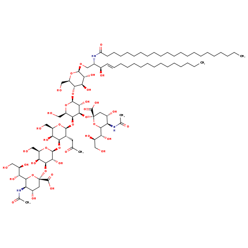 | SMILES | CCCCCCCCCCCCCCCCCCCCCC(=O)N[C@@H](CO[C@@H]1O[C@H](CO)[C@@H](O[C@@H]2O[C@H](CO)[C@H](O[C@@H]3O[C@H](CO)[C@H](O)[C@H](O[C@@H]4O[C@H](CO)[C@H](O)[C@H](O[C@@]5(C[C@H](O)[C@@H](NC(C)=O)C(O5)[C@H](O)[C@H](O)CO)C(O)=O)[C@H]4O)[C@H]3CC(C)=O)[C@H](O[C@@]3(C[C@H](O)[C@@H](NC(C)=O)C(O3)[C@H](O)[C@H](O)CO)C(O)=O)[C@H]2O)[C@H](O)[C@H]1O)[C@H](O)\C=C\CCCCCCCCCCCCC |