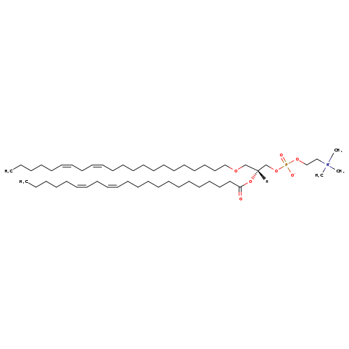 | Description | PC(O-22:2(13Z,16Z)/22:2(13Z,16Z)), also known as gpcho(22:2/22:2) or gpcho(44:4), belongs to the class of organic compounds known as 1-alkyl,2-acylglycero-3-phosphocholines. These are glycerophosphocholines that carry exactly one acyl chain attached to the glycerol moiety through an ester linkage at the O2-position, and one alkyl chain attached through an ether linkage at the O1-position. Thus, PC(O-22:2(13Z,16Z)/22:2(13Z,16Z)) is considered to be a glycerophosphocholine lipid molecule. PC(O-22:2(13Z,16Z)/22:2(13Z,16Z)) is a very hydrophobic molecule, practically insoluble (in water), and relatively neutral. |