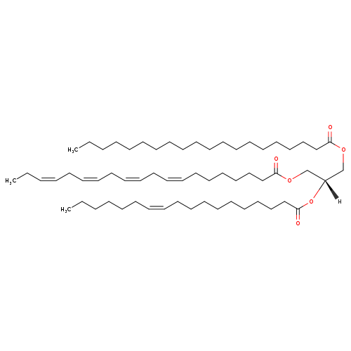 | 1-Arachidonyl-2-vaccenoyl-3-eicsoatetraenoyl-glycerol | HMDB | | 1-Eicosanoyl-2-(11Z-octadecenoyl)-3-(8Z,11Z,14Z,17Z-eicosapentaenoyl)-glycerol | HMDB | | TAG(20:0/18:1/20:4) | HMDB | | TAG(58:5) | HMDB | | TG(20:0/18:1/20:4) | HMDB | | TG(58:5) | HMDB | | Tracylglycerol(20:0/18:1/20:4) | HMDB | | Tracylglycerol(58:5) | HMDB | | Triacylglycerol | HMDB | | Triglyceride | HMDB | | TG(20:0/18:1(11Z)/20:4(8Z,11Z,14Z,17Z)) | Lipid Annotator |